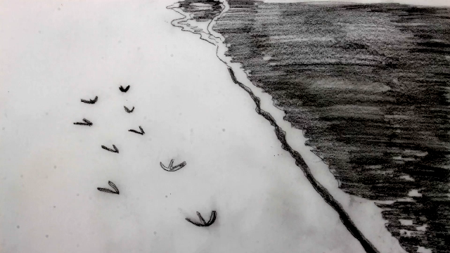 A girl draws her missing limb on the sand that will shortly after be erased by the waves.